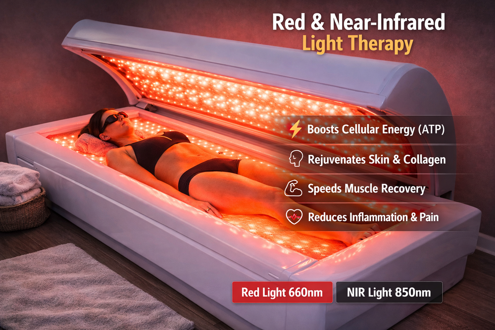 Full-body red and near-infrared light therapy designed to support skin health, recovery, and daily energy. Delivered as a comfortable session in a controlled setting, with guidance on frequency based on your goals.